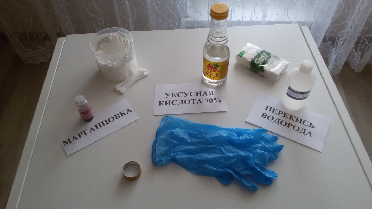 Создаю «волшебную жидкость»: насыпаю в пробку немного марганцовки и с помощью взрослых добавляю уксус. Даю марганцовке хорошо раствориться в уксусе, а затем очень осторожно ватной палочкой наношу раствор на запись и вижу, как чернила плавно исчезают. Кажется, получилось, но чернила-то исчезли, а коричневый оттенок от марганцовки остался. Промокнув салфеткой и подсушив лист, беру ещё одну ватную палочку, смачиваю её перекисью водорода и наношу на полученные разводы. Получилось удалить следы марганцовки.