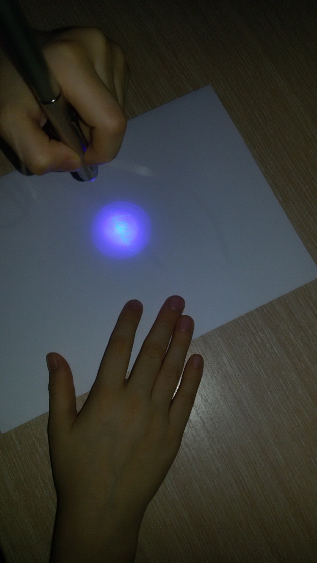 В наше время новых технологий появились невидимые шариковые ручки. Такая есть и у меня (Приложение 7). Написав ей на листе бумаги, мы ничего не видим, а посветив лазерным фонариком, который находится на другой стороне ручки, запись появляется (Приложение 8).