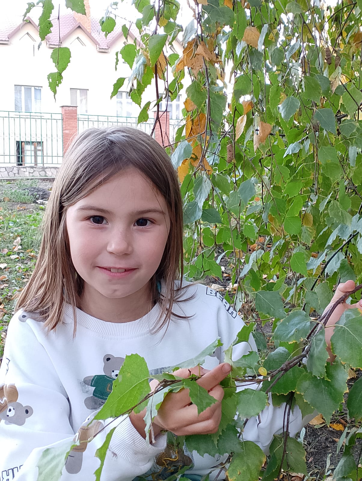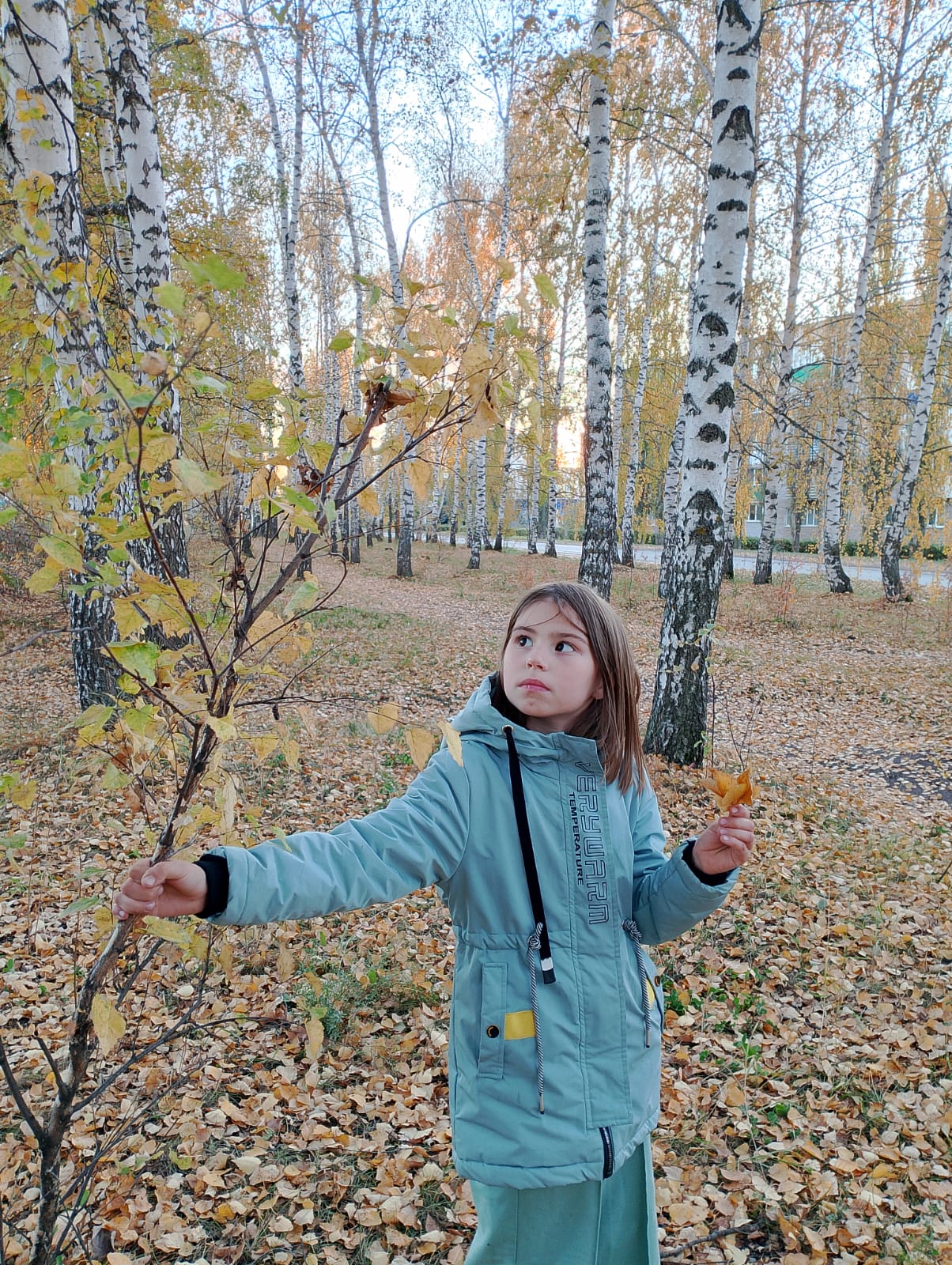 Позже я подошла к берёзе, которая растёт в посадке, возле дома, пригнула нижнюю ветку и потрясла её. Почти что все листья оказались на земле. Затем я попробовала оторвать листочек, который остался на ветке, лист очень легко отделился.