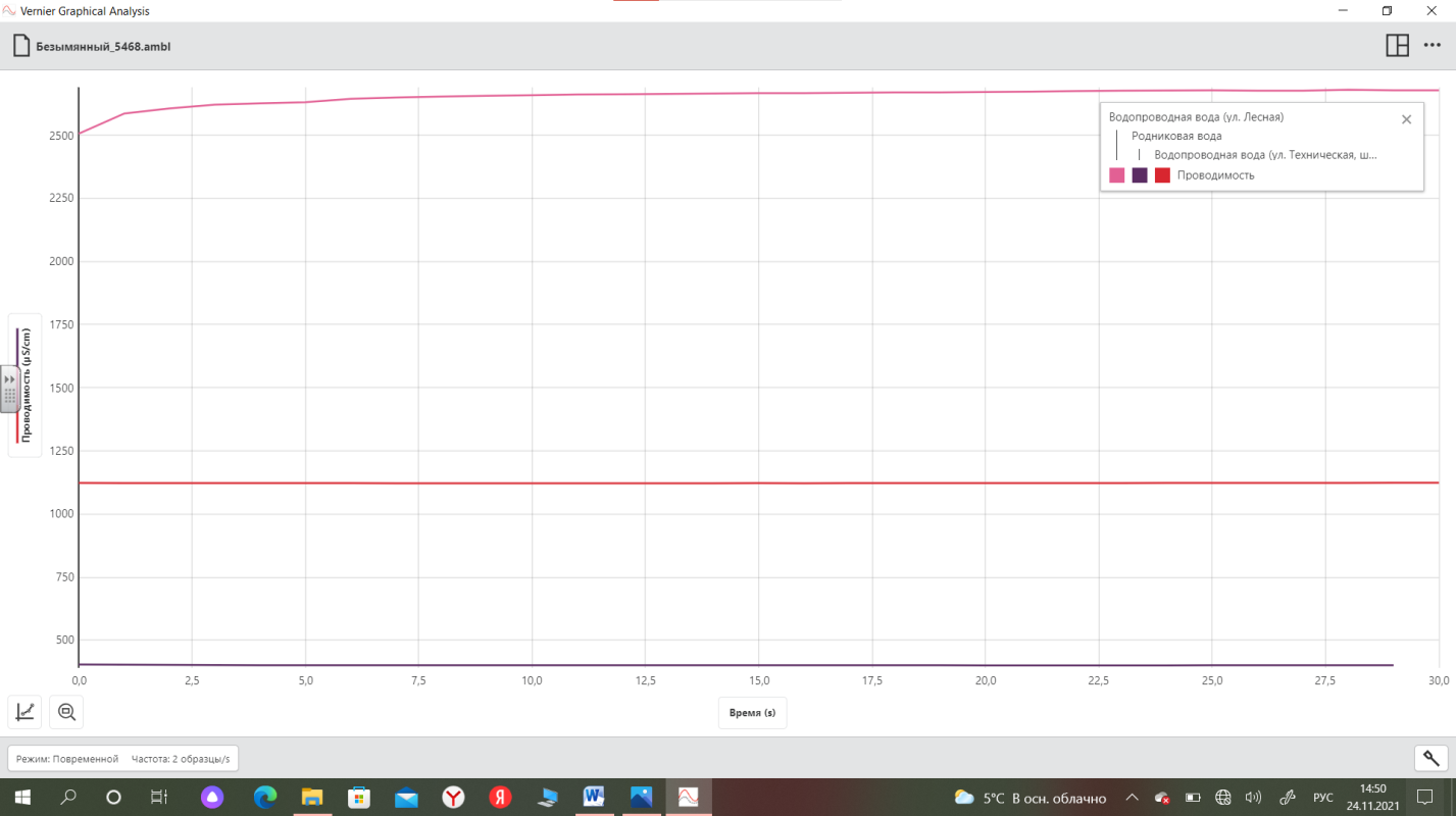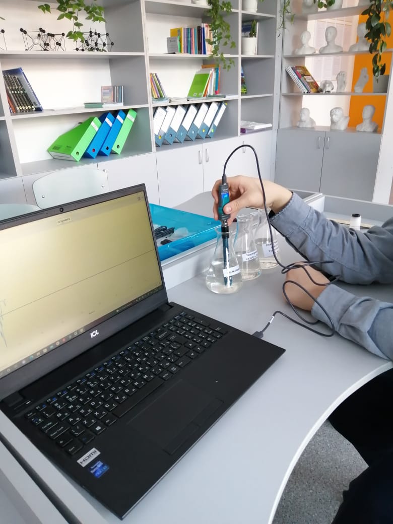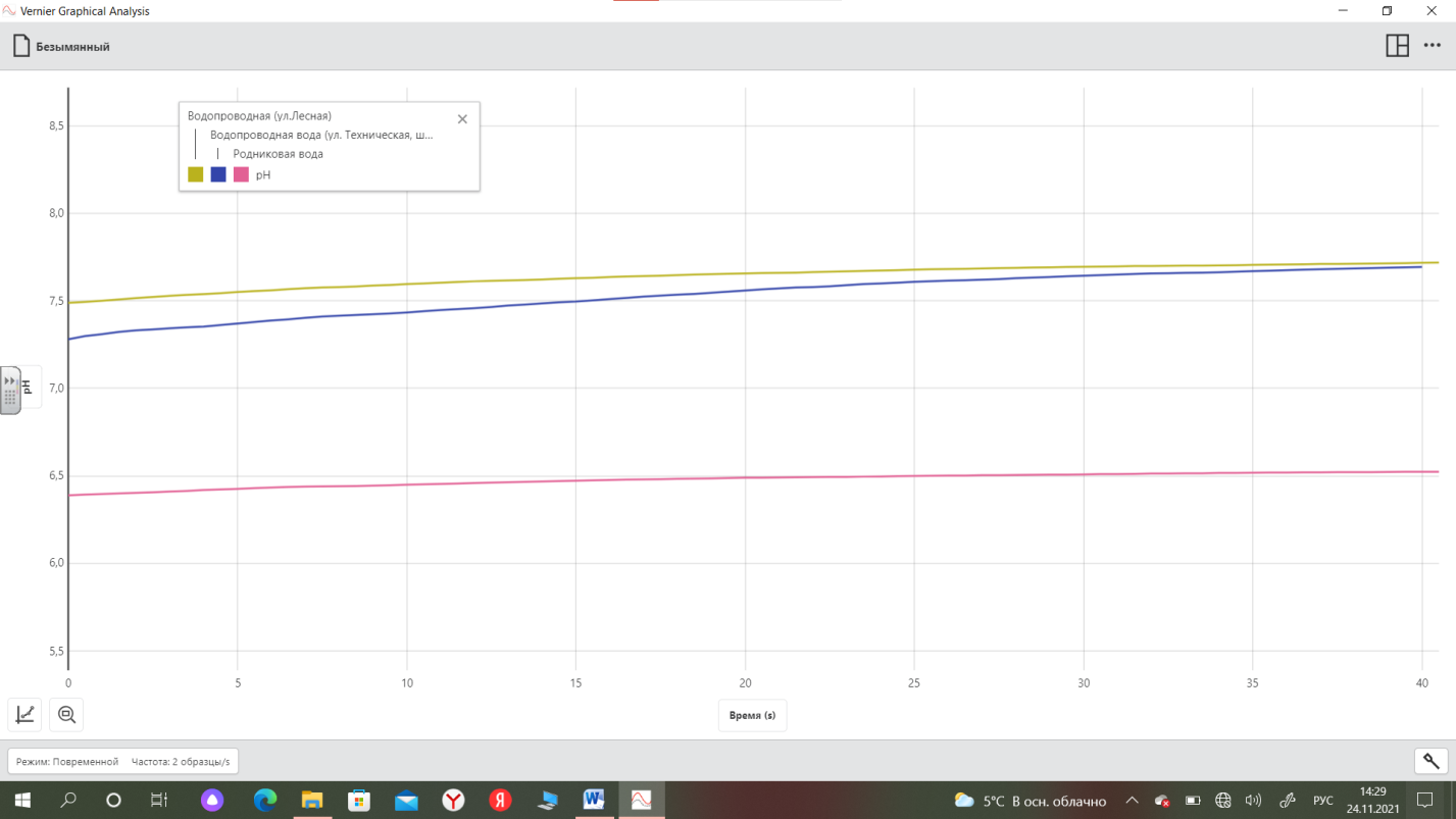 pH в исследуемой воде мы оценили с помощью датчика кислотности цифровой лаборатории и получили следующие результаты: