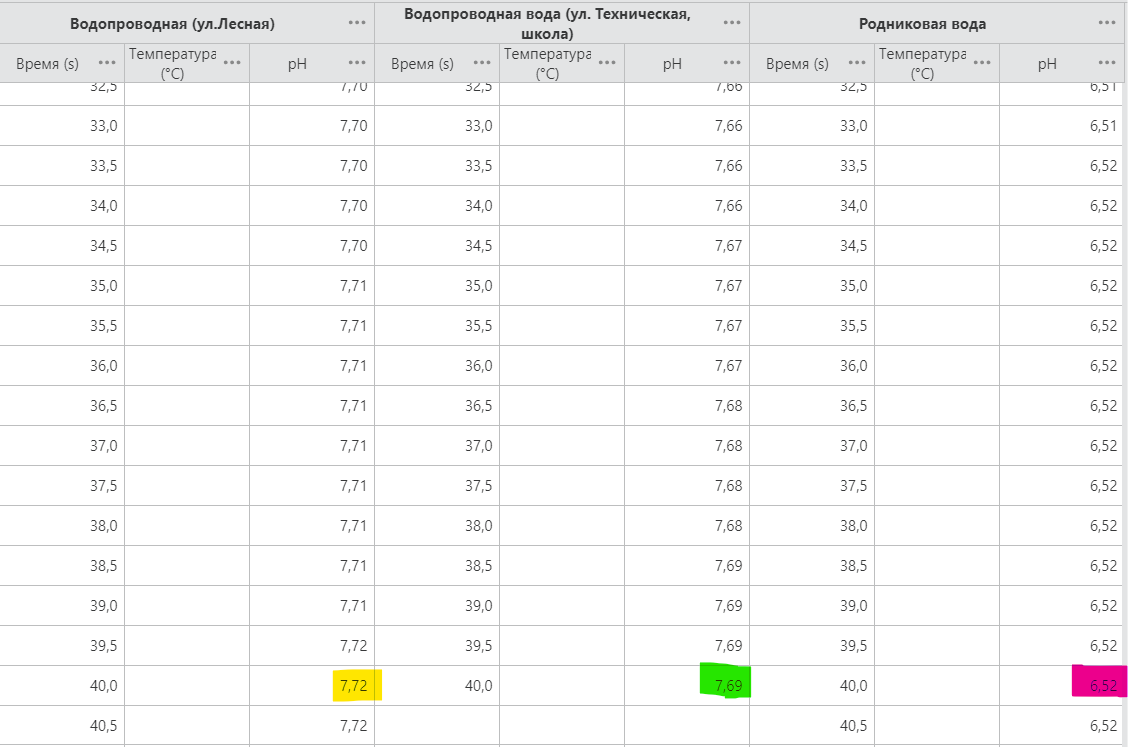 Показатель кислотности среды (pH) | Цифровая лаборатория. Датчик измерения кислотности | 6.52 | 7.72 | 7.69 |