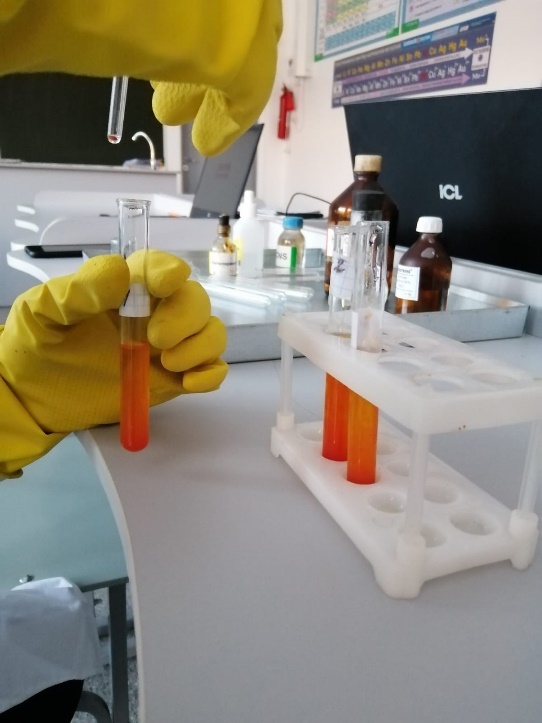 В пробах воды определяем концентрацию гидрокарбонат-ионов. К пробе добавляем 2 капли метилового оранжевого. При этом проба приобретает желтую окраску. Титруем пробу раствором 0,05 соляной кислоты до перехода желтой окраски в розовую. На пробы воды из родника затратили 1 каплю соляной кислоты, на пробу водопроводной воды по ул.Лесной - 3 капли и по ул.Технической – 2 капли.