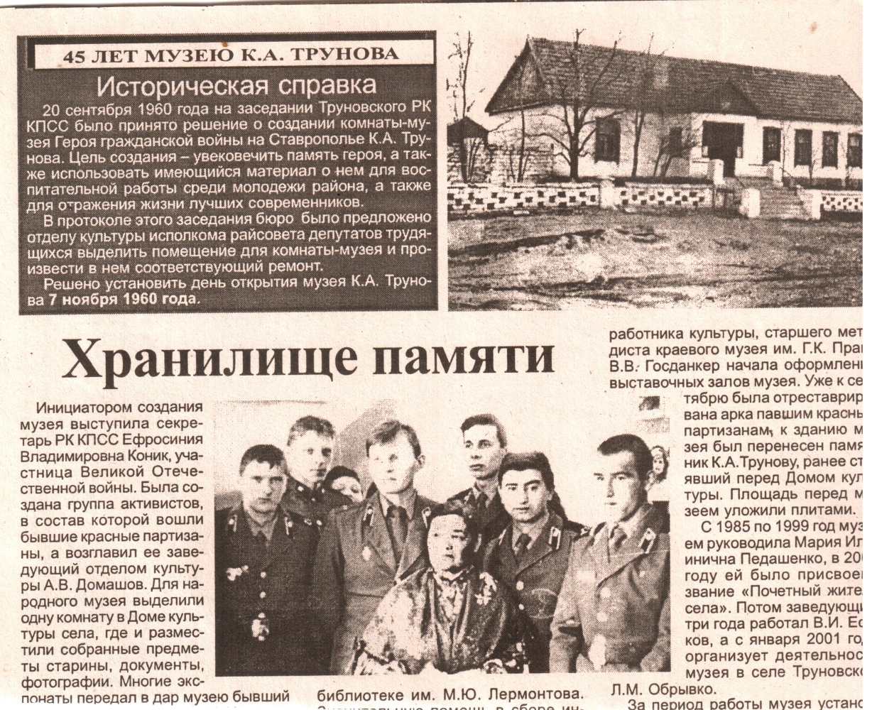 20 сентября 1960 г. на заседании Труновского РК КПСС было принято решение о создании музея -комнаты героя гражданской войны на Ставрополье К.А. Трунова. Для народного музея выделили одну комнату в Доме культуры села, где и разместили собранные предметы старины, документы, фотографии.