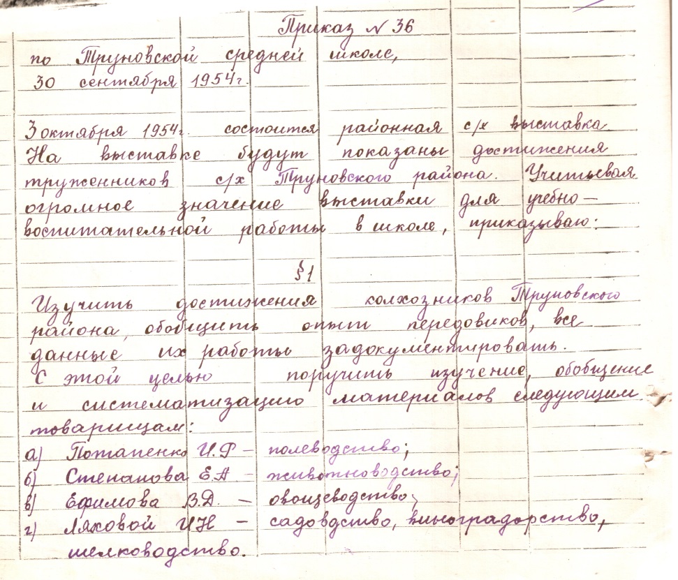 Копия приказа №36 от 30.09.54 г. из Книги приказов за 1954 г.