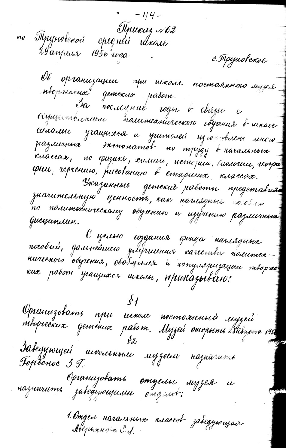 Копия приказа № 62 от 29.04.56 г. из Книги приказов за 1956 г.