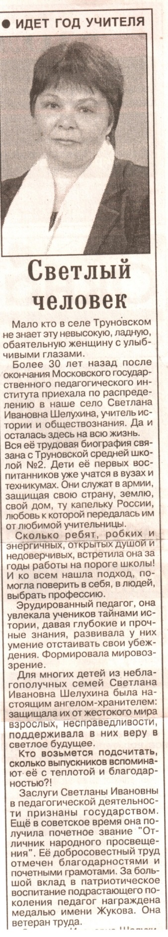 Более 30 лет отдала нашей школе обаятельная женщина Светлана Ивановна Шелухина. Вся ее трудовая биография связана с Труновской средней школой №2. Сколько исследовательских работ написано под ее руководством! Сколько сделано для создания экспозиций Зала боевой славы!