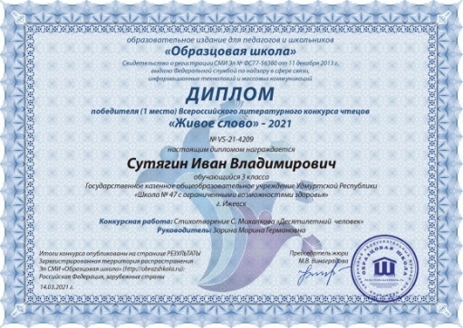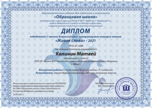 В рамках подготовке к празднованию Дня Победы был проведен конкурс-фестиваль чтецов «Стихи о войне», победители конкурса были опубликованы на учительских сайтах (Сутягин И., Калинин М.) и награждены грамотами.