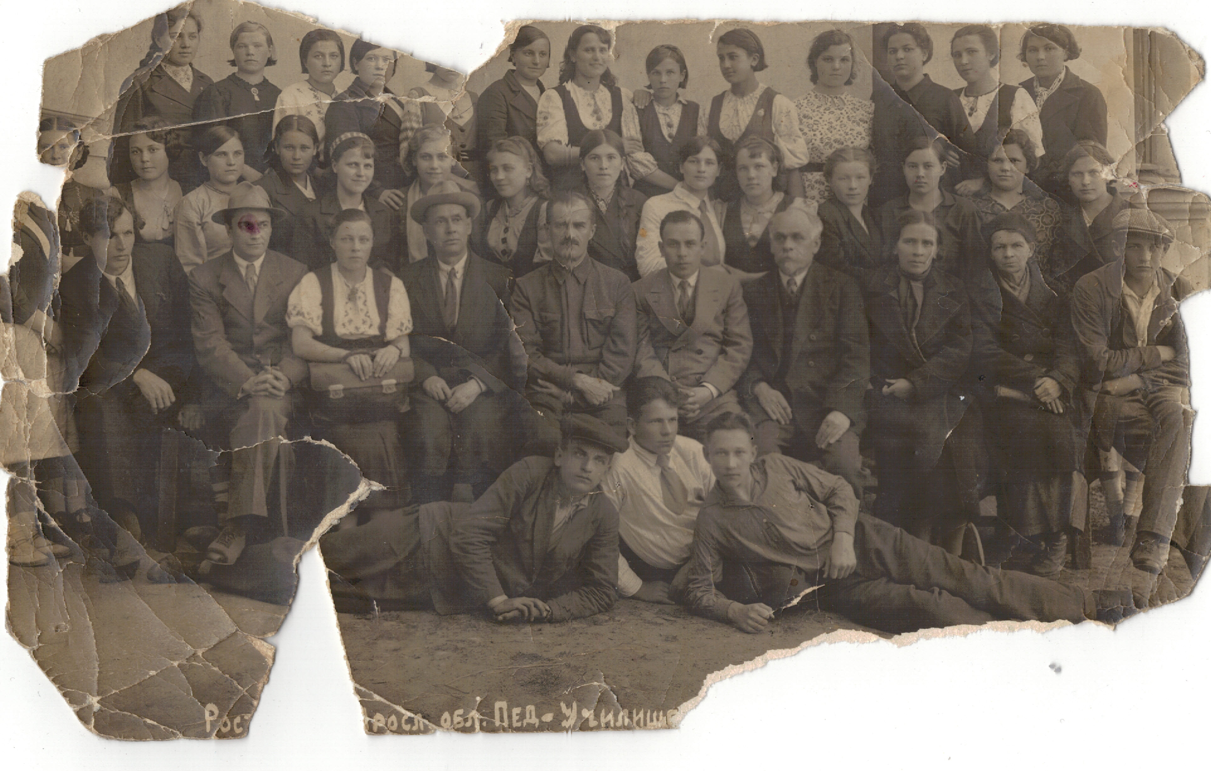 Разбирая архив Ростовского педагогического колледжа, мы натолкнулись на одну фотографию. Она небольшая, прямоугольная, её размер 10х16. Углы и отдельные стороны фотографии надорваны, лица некоторых людей просматриваются с трудом. Внизу на фотографии сделана надпись, но плохо сохранившаяся. Отчетливо можно только прочитать - Пед.училище.