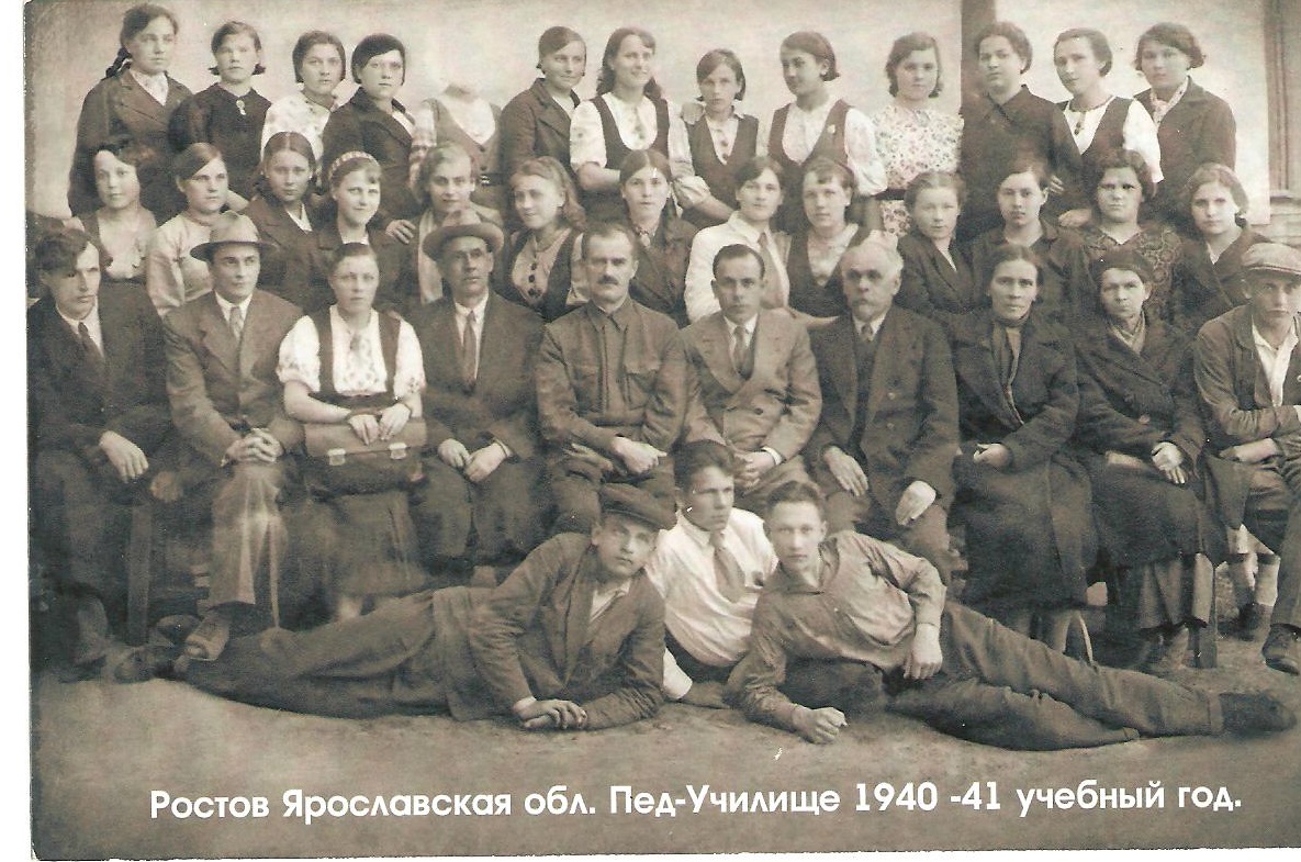 На первом этапе я решили узнать имена преподавателей Ростовского педагогического училища и обратились к сотрудникам Ростовского Архива. Было установлено, что в центре снимка – директор Ремнёв Александр Федорович (шестой слева), Он с 1936 года (Приказ Облоно от 08.098.1936 года) работал в Ростовском педучилище, его взяли на фронт в июне 1941 года, он прошел всю войну и, возвратившись, был назначен директором Переславского педучилища.