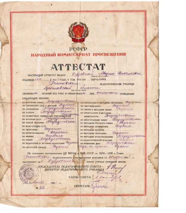 На фотографии, принадлежавшей Морозову А.И., восстановлены все изображения, кроме одной в верхнем ряду 5. На снимке – выпускники 1940-1941 года, 28 девушек и 4 юноши. По книге Приказов нам удалось составить список учащихся этой группы. Всех труднее было установить личность каждого. Тогда я обратились в местную газету с просьбой опубликовать нашу фотографию. Долгое время вестей никаких не было. В мае в колледж пришла женщина и сказала, что она проживает в Ленинградской области и летом приезжает в родные места на станцию Итларь. Она в газете нашла заметку с фотографией и узнала на ней свою мать – Дубровину Марию Николаевну, выпускницу 1941 года (второй ряд сверху, 9-слева, девушка с косами). Оказалось, Казаченко Л.Н. уже долгие годы собирает материал о своей матери. Людмила Николаевна рассказала нам, что Дубровина Мария Николаевна родилась 1 ноября 1923 в деревне Покров Ростовского района Ярославской области. Прожила Мария Николаевна, как и люди её поколения, трудную жизнь. Семья была большая и дружная, здесь росли 5 детей. Когда Марии было десять лет, горе пришло в дом - раскулачивание. Семью ждала ссылка в Сибирь. Дед (мамин отец) был церковный староста Пречистинской церкви. Его арестовали и увезли в Ленинград, где и расстреляли в Левашовской роще. Всё имущество и дом описали, забрали, и всю семью готовили к выселению. Но старшая сестра посадила всех малышей на пол и сказала: «Вывозите вместе с детьми!» Что остановило чекистов – неизвестно. Дети остались жить в доме и начали всё заново. Мария потом долго скрывала этот факт семейной биографии. В 1938 году Мария Дубровина закончила Итларьскую школу и подала заявление в Ростовское педучилище на школьное отделение. В то время в учебное заведение принимали только по классовому принципу: детей крестьян, батраков, середняков и бедноты. При поступлении надо было сдавать экзамены по русскому языку (устно и письменно), по математике (устно и письменно) по географии и Конституции. Вероятно, Мария хорошо училась в школе, экзамены были сданы успешно. Она рано потеряла мать, которая умерла в 1940 году, оставив пятерых детей (младшей Ане было всего два с половиной года) на руках отца и его сестры Зинаиды. Мария Дубровина с желанием училась в педучилище. Это было трудное время, особенно после смерти матери. Жила в студенческом общежитии №2, как и многие девчонки-однокурсники, в комнате проживало до 20 человек. Жили дружно. Студенческая жизнь шла своим чередом. Выступали на праздниках, на собраниях, ездила по деревням в села с агитбригадой. Закончились последние экзамены, все обменялись фотографиями с подругами и ждали торжественного мероприятия по случаю вручения аттестатов об образовании. Но 22 июня началась Великая Отечественная война. Она сломала все жизненные планы выпускников педагогического училища. Аттестат об образовании Дубровина Мария получила 23 июня 1941 года. Козаченко Л.Н. привезла нам в музей истории аттестат своей матери. Приложение№1.