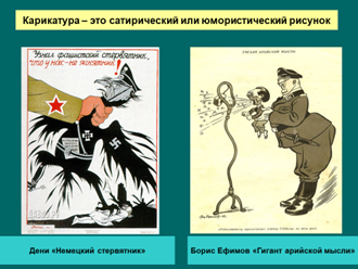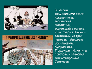 В России после 1917 г. карикатура становится одним из ведущих жанров политической наглядной агитации. Исключительная роль принадлежала карикатуре в годы Великой Отечественной войны: в плакатах, листовках, фронтовых газетах художники – карикатуристы бичевали и жестоко высмеивали врага.