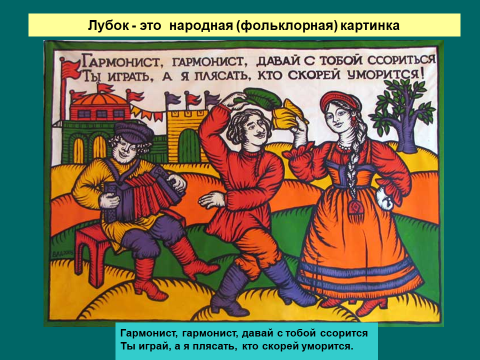 Лубок - это народная (фольклорная) картинка. С середины 17в. на Руси впервые появились печатные картинки, называемые «фряжскими» (иностранными). Затем эти картинки называли «потешными листами», во второй половине 19 в. их стали называть лубками. В лубке никогда не было горя или плача. Он только радовал и веселил, да иногда обличал, но это делал с большим юмором и достоинством. Лубок вселял в людей веру в себя, в свои силы. В лубке никогда не было горя или плача. Он только радовал и веселил, да иногда обличал, но это делал с большим юмором и достоинством. Лубок вселял в людей веру в себя, в свои силы.