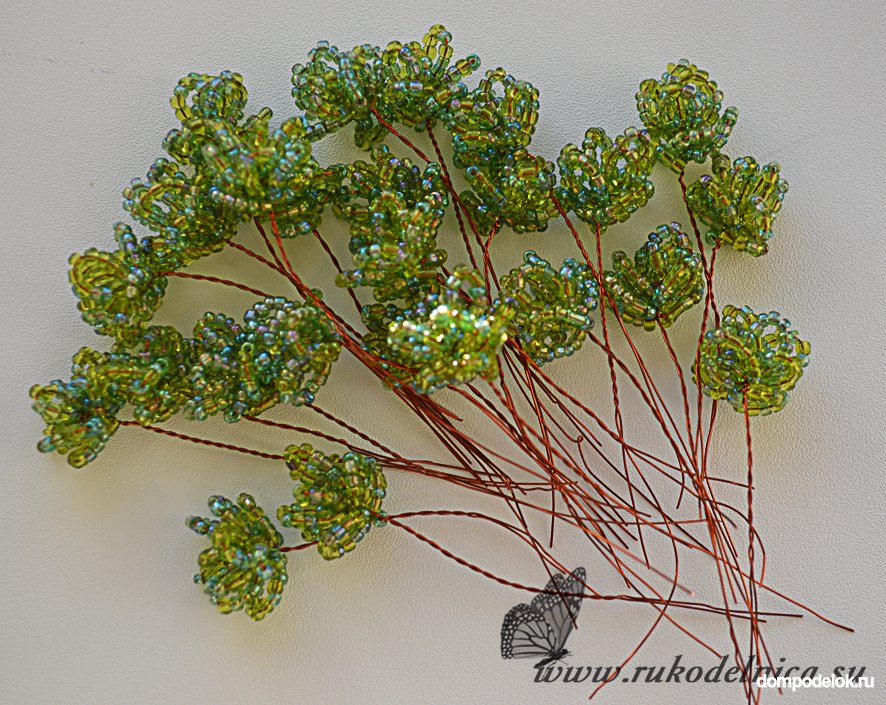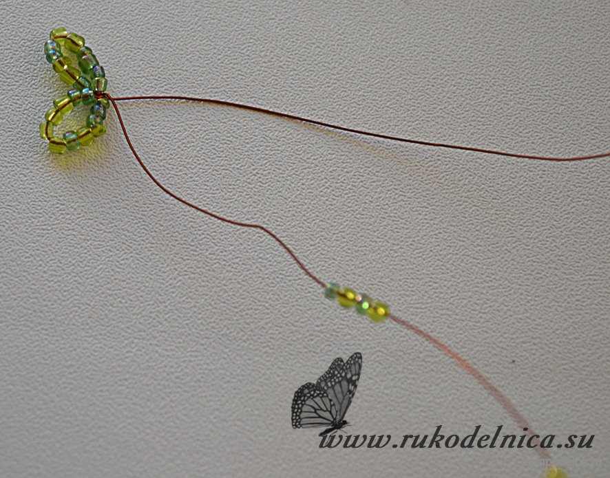 Далее пропускаем 0,5 см проволоки, опять отделяем 5-7 бисеринок и закручиваем два раза и т.д. На ветке можно сделать от 10 до 17 маленьких листиков. Оставляем 5- 10 см свободной проволоки. Отрезаем проволочную заготовку с листиками.