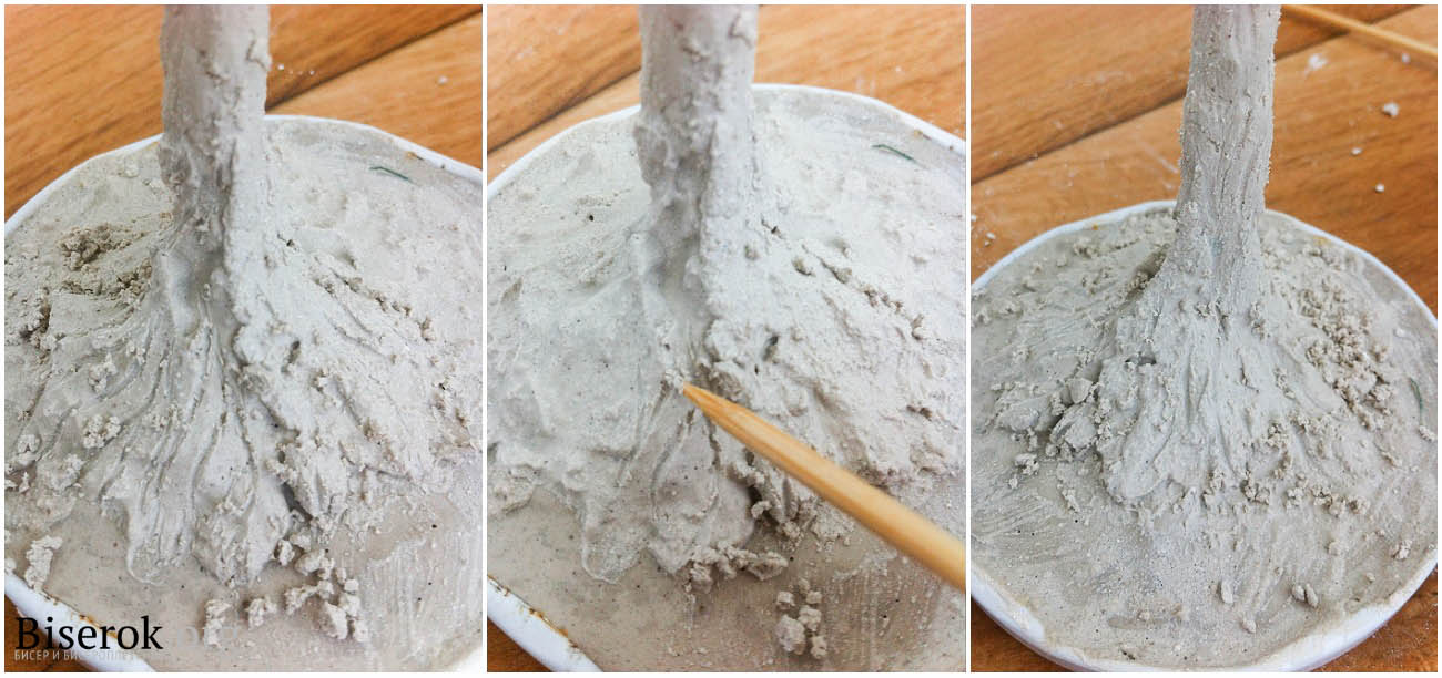 Устанавливаем деревце. Придерживая его, ждём, пока алебастр не затвердеет.