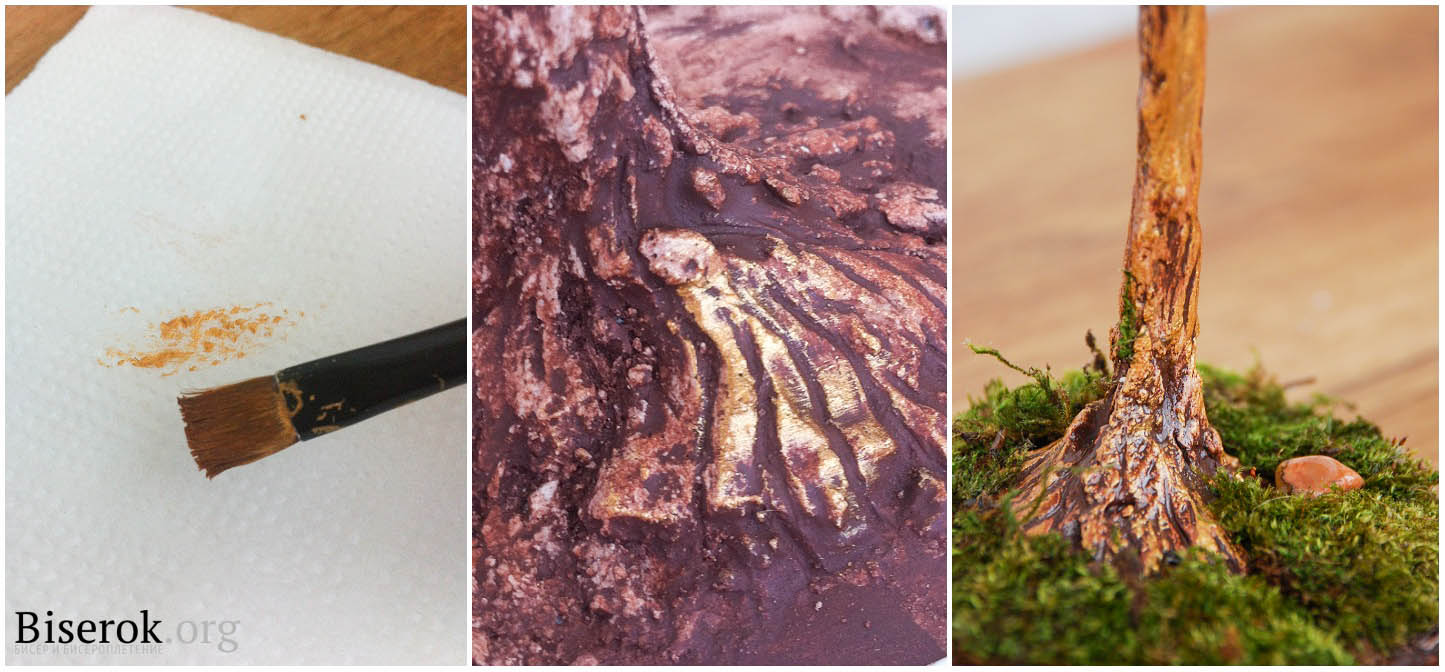 Смешиваем гипс с клеем в соотношении 1:1, добавляем чуть-чуть воды, и получившимся раствором обмазываем ствол дерева, стараясь придать ему более натуральный вид.