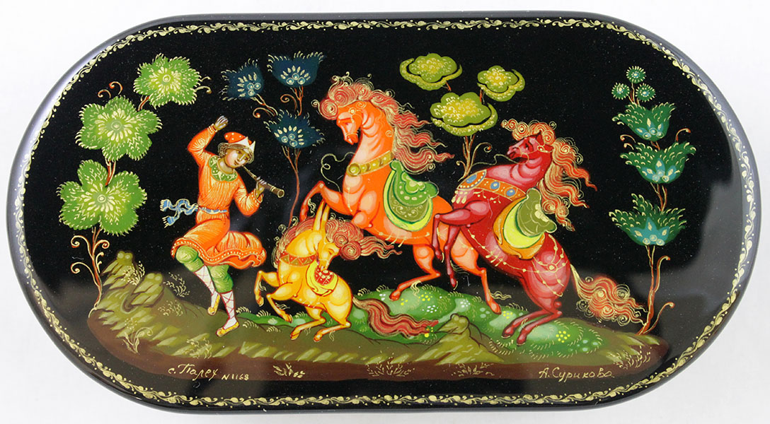 От напряженного рассматривания глаза мои слегка утомляются. Я насмотрелся и хочу спрятать мой уникум. Но тут, в последний момент, глаза мои находят в углу миниатюры маленькие черные буквы, которые втрое мельче самого мелкого газетного шрифта: «И. Голиков, село Палех, 1926 г.». «Палех», — вспоминаю я, и при этом слове мысли мои улетают далеко отсюда, минуя подмосковную осень, сквозь леса, сквозь ржаные просторы, сквозь сенокосные поймы — в то село, где искусство красиво властвует над человеком.