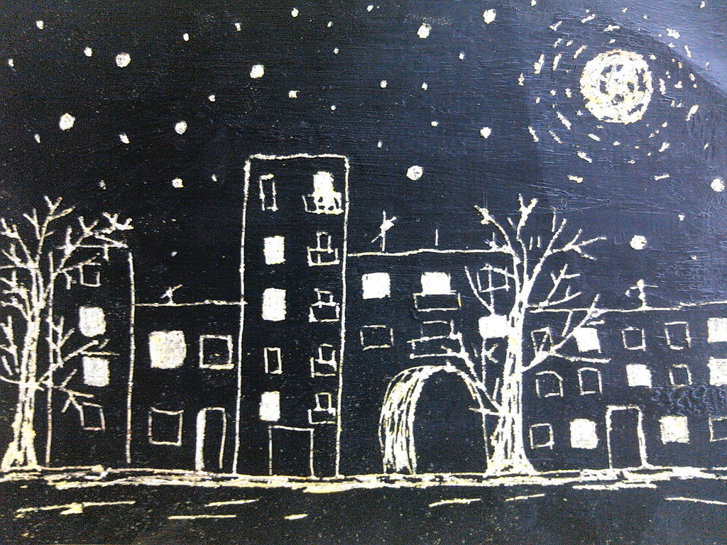 Можно выделить ещё один вид граттажа, с помощью восковой свечи. Поверхность белого картона обработать свечой. Нужно разогреть воск на водяной бане и нанести с помощью кисти. Черной сухой гуашью заполнить восковую поверхность. Когда лист высохнет процарапываем детали рисунка. Удачна идея для зимних ночных пейзажей.