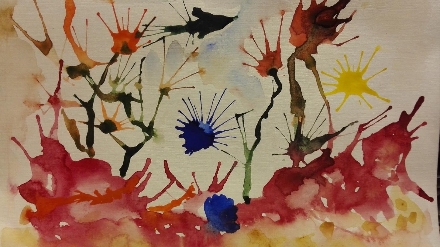 - Монотипия с дорисованными элементами: нанесение цветных пятен на поверхность, с последующим отпечатыванием на чистый формат и дорисовкой различными элементами, переходящими в фантазийный образ.
