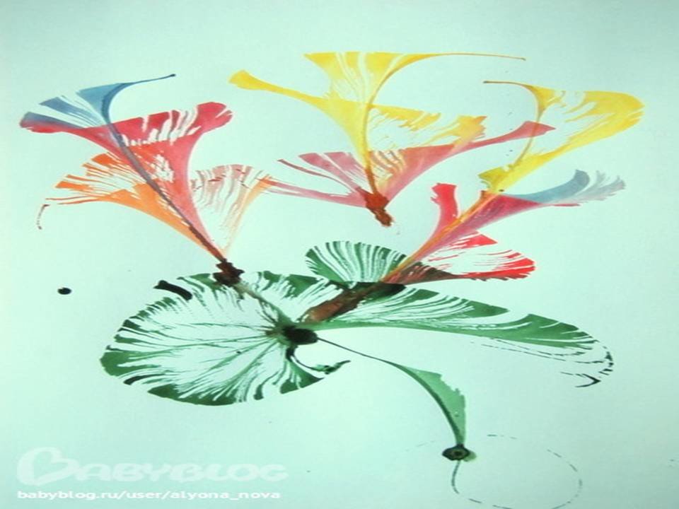 Например,раздувание краски. На бумаге оставляют пятно краски, разбавленной водой, а затем опускают в нее пластиковую трубочку и раздувают кляксу в разных направлениях, наклоняя трубочку.
