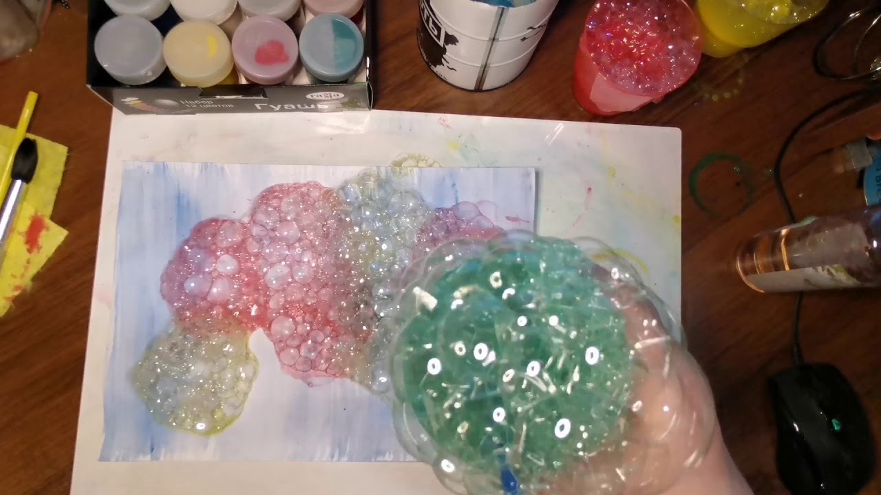 Техника рисование пеной отличается тем, что пену смешивают с гуашью.