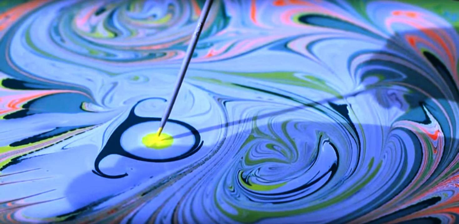 Существует японская техника. Она интересна тем, что на поверхность воды выкладывают картонные кружки и наливают на них краску. В результате, в процессе движения кругов, краска оставляет за собой живописные разводы, из которых и получается рисунок. Либо последовательно наносятся брызги туши, которые потом расходятся кругами. Не используется никаких загустителей, следовательно, краска должна держаться на поверхности воды, японцы используют нерастворимую цветную тушь.