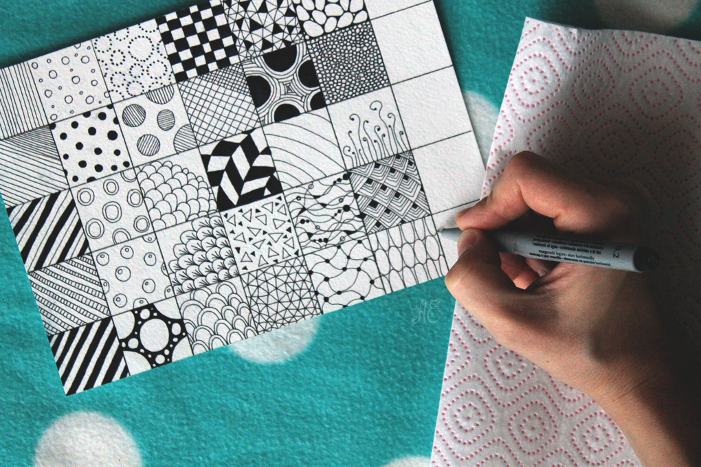 Для знакомства обучающихся с данной техникой, следует показать уже существующие, запатентованные узоры зентагла, созданные Марией Томас. Затем предложить самостоятельно придумать свои узоры. Для этого лист бумаги делится на квадраты примерно размером 9х9 см. В каждом квадрате необходимо придумать свой неповторимый узор, используя не более чем 6 штрихов. Очень важно объяснить, что резинку и карандаш нельзя использовать. Каждый штрих, линия уже являются частью узора. Картинку не нужно представлять в уме, необходимо расслабиться и не бояться ошибок, так как их не может быть на рисунке вообще. Необходимо отталкиваться от каждой линии постепенно, создавая неповторимый узор. Работа выполняется чёрным фломастером или линером.