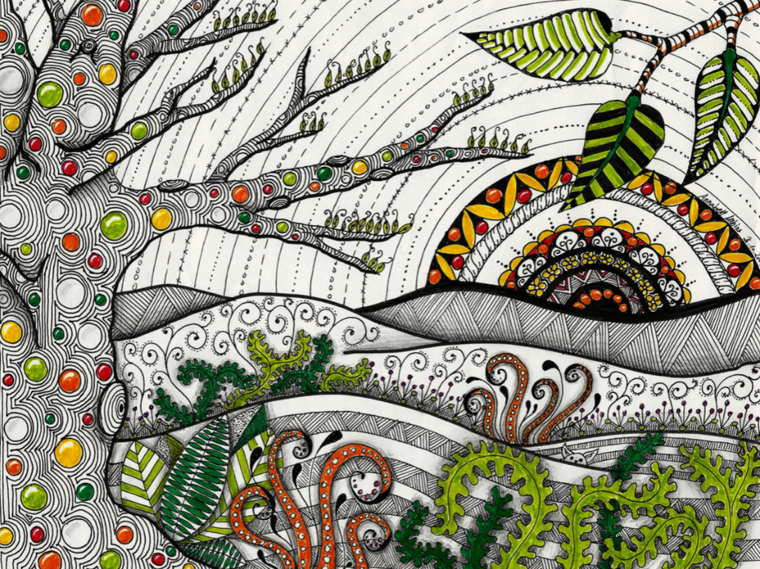Можно усложнить задачу. Например, обучающиеся делают контурный рисунок пейзажа линером. Композиция должна быть простой и понятной, так как работаем без карандаша и резинки. Рисуем ствол дерева на первом плане, линию горизонта, холмы или горы, солнце на горизонте. Затем чёрным линером или цветными гелевыми ручками придумываем для каждого объекта свой повторяющийся узор. Так заполняем всё пространство.