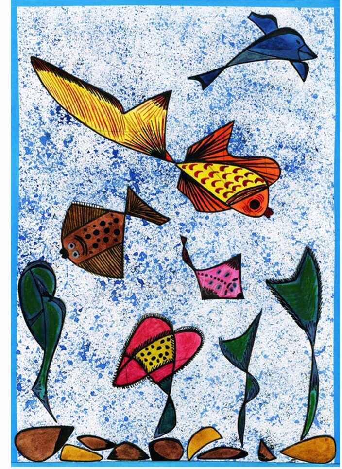 Итак, рассмотрим, как познакомить обучающихся с данной техникой. На бумаге простым карандашом нужно нанести бессмысленный рисунок. Для этого проводим сначала длинную линию в любом направлении, а затем свободно «кружим» по бумаге, рисуя петли и изгибы, пересекая уже нарисованные линии новыми. При этом стараемся не отрывать карандаш от бумаги. Внимательно рассматриваем получившиеся каракули. «Включаем» своё воображение и ищем среди линий морских животных, птиц, рыб. Если у вас не получается увидеть образы, можно повернуть лист бумаги. Чтобы образы не терялись, обводим их фломастерами. Далее раскрашиваем фломастерами или красками. Тонкой кисточкой прорисовываем детали. Если хорошо присмотреться, можно найти дополнительный элементы композиции. Затем можно раскрасить фон.