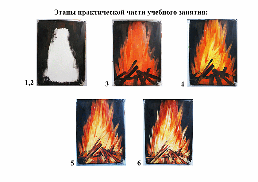 3. | Изучение нового образовательного материала. (20 мин.) | Преподаватель объясняет, что для изображения огня понадобится ограниченная палитра: белый, желтый, красный цвета гуаши. Чем больше оттенков ученик получит в результате смешивания этих 3х цветов, тем реалистичнее получится изображение. Тон в костре распределяется по принципу: светлые оттенки в центре, темные снаружи. Изучение материала на примерах демонстрации наглядных методических плакатов, детских работ из методического фонда. | Слушают преподавателя. Изучают методические материалы ( плакаты, работы из методического фонда), отвечают на вопросы педагога, задают вопросы. |