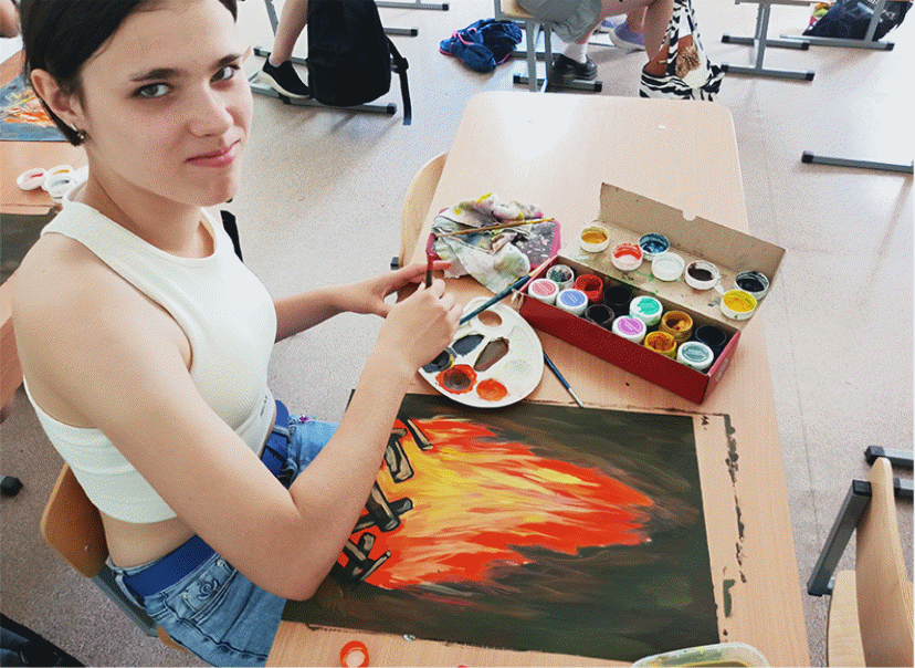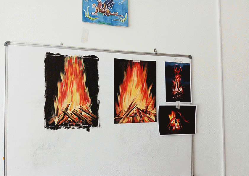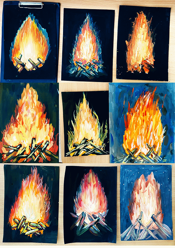 На работах обучающихся появляются образы яркого костра на темном фоне .. Преподаватель советует исправить композицию, если замечает ошибки в работе обучающихся.