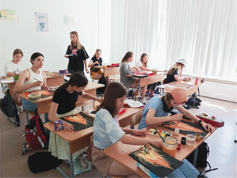 В части повторения ранее изученного материала преподавателем использовался метод беседы с широким вовлечением учащихся в эту беседу. Рассматривались основные понятия контрастных (дополнительных) цветов, базовые принципы их взаимодействия между собой. Преподаватель, используя наглядный материал, напомнила обучающимся, о теории цветовой гармонии и практическом её применении в изобразительном искусстве и, в частности, в практической работе данного занятия. Детализируя задачу практической части занятия, преподаватель внесла некоторую перестройку и иной подход к ранее использованным практическим решениям в работах, добавив к нему новое практическое умение. Грамотное построение преподавателем этой части, использование активных методов: беседы, опроса, разнообразие повторяемого материала и внесение элементов новизны позволило ученикам свободно и с большим желанием перейти к практической части занятия.
