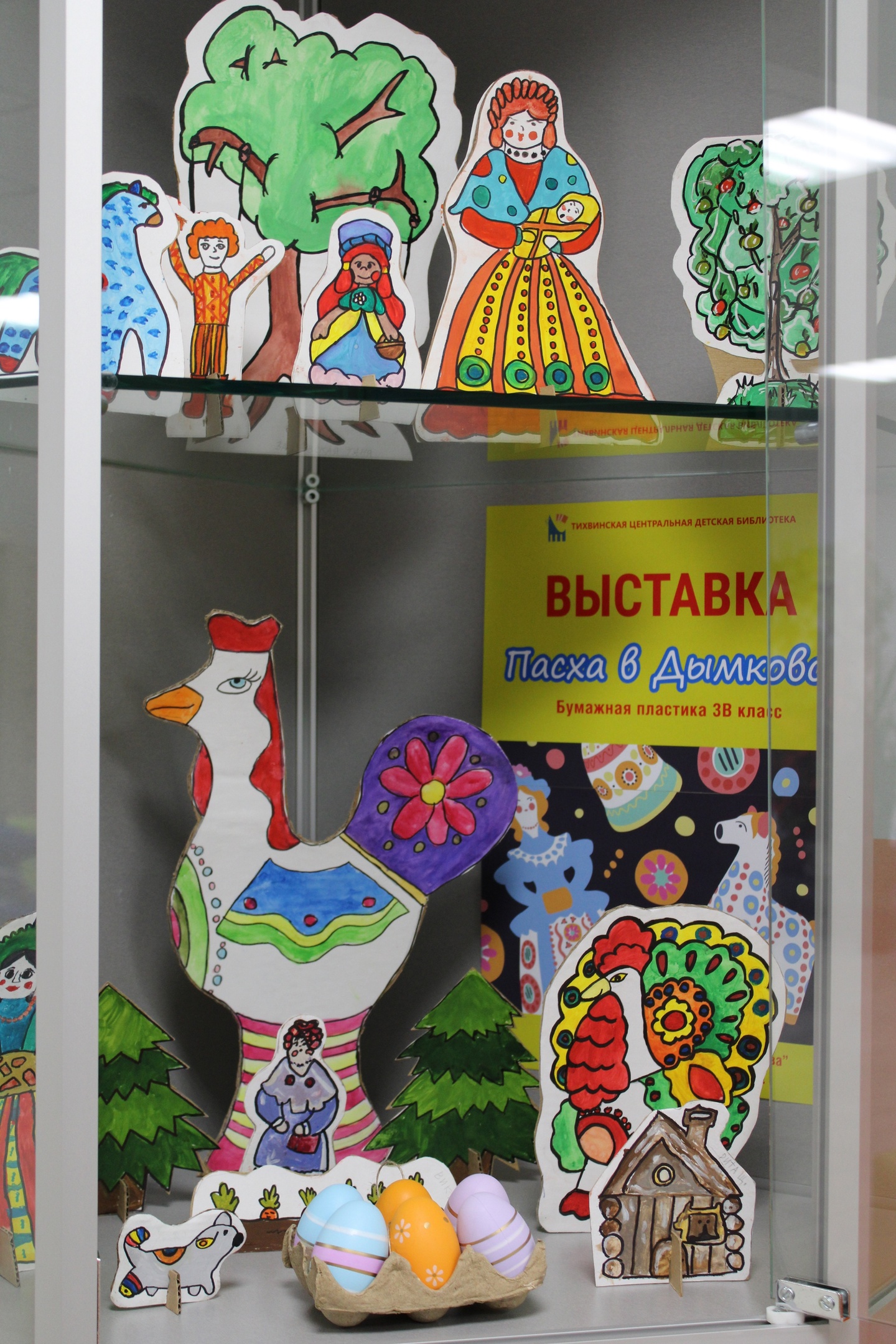 3. Заключительный этап | 120 мин | Помещение детской центральной библиотеки г. Тихвина | Преподаватель изготавливает афишу выставки в графическом редакторе, распечатывает ее, Преподаватель выставляет экспонаты выставки в стеклянных выставочных стеллажах ДЦБ, добавляя необходимые детали, размещает изготовленную афишу. Сотрудники ДЦБ размещают новость об открытии выставки на своей странице в социальной сети В Контакте | Выставка открылась 5 марта 2023 г. в холле центральной детской библиотеки г. Тихвина в преддверии праздника Пасхи |