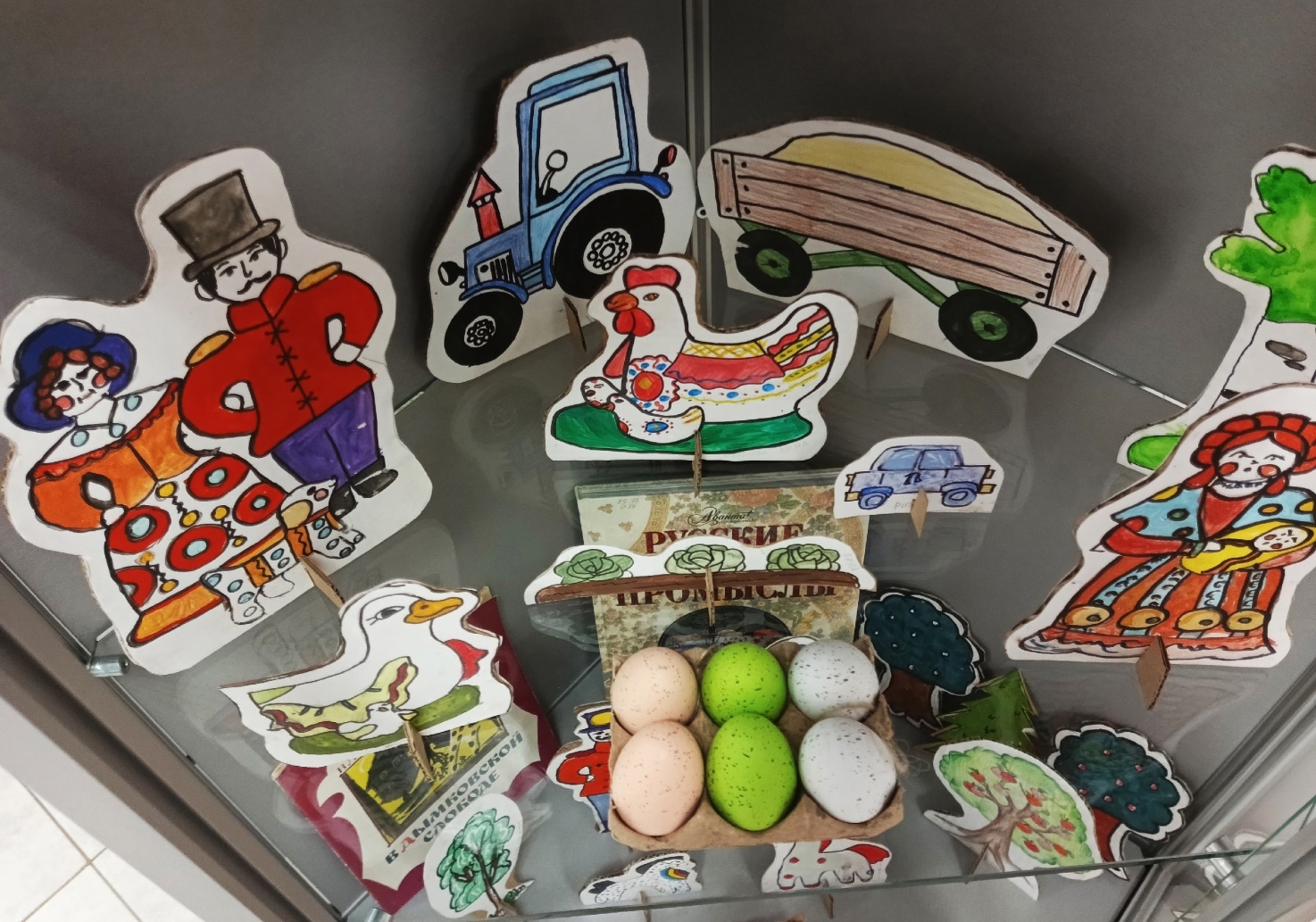 Идея сделать выставку кукол-фигурок возникла незадолго до праздника Пасхи. На занятии по бумажной пластике изучали изготовление картонной куклы-фигурки на подставке. Решено было сделать фигурки, объединенные общим сюжетом: жители деревни Дымково в преддверии праздника Пасхи. Ученики самостоятельно выбирали себе героев: кто то выбрал барышню с ребенком, кто то кавалера, семью, домашних животных, дома жителей деревни, деревья, автомобили и даже трактор с прицепом. Название выставки выбирали голосованием.