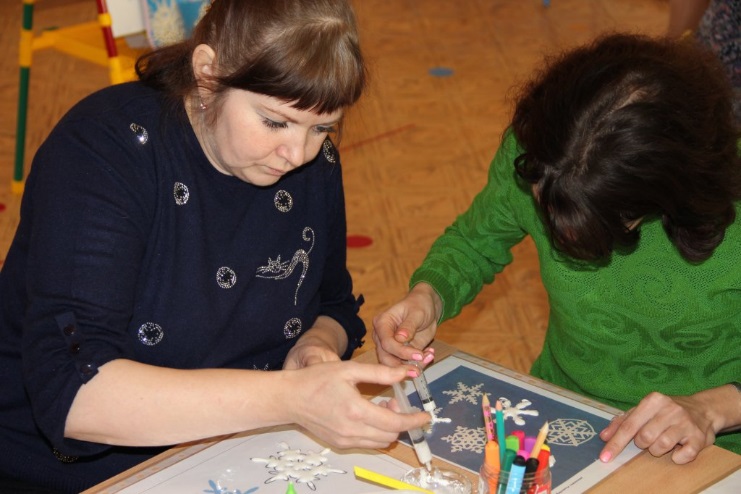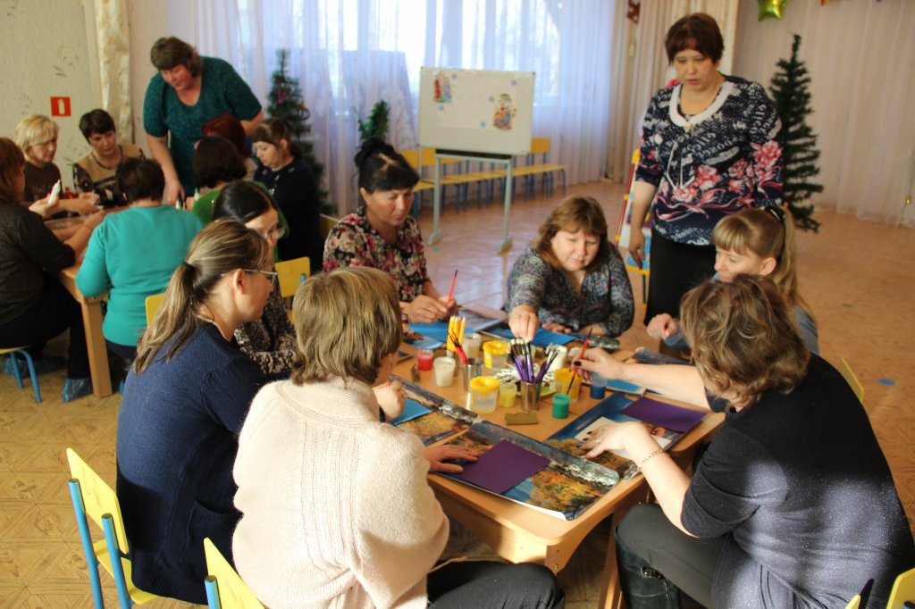 Размещение: участники мастер-класса рассажены за столы, на которых расположены материалы для изобразительной деятельности.