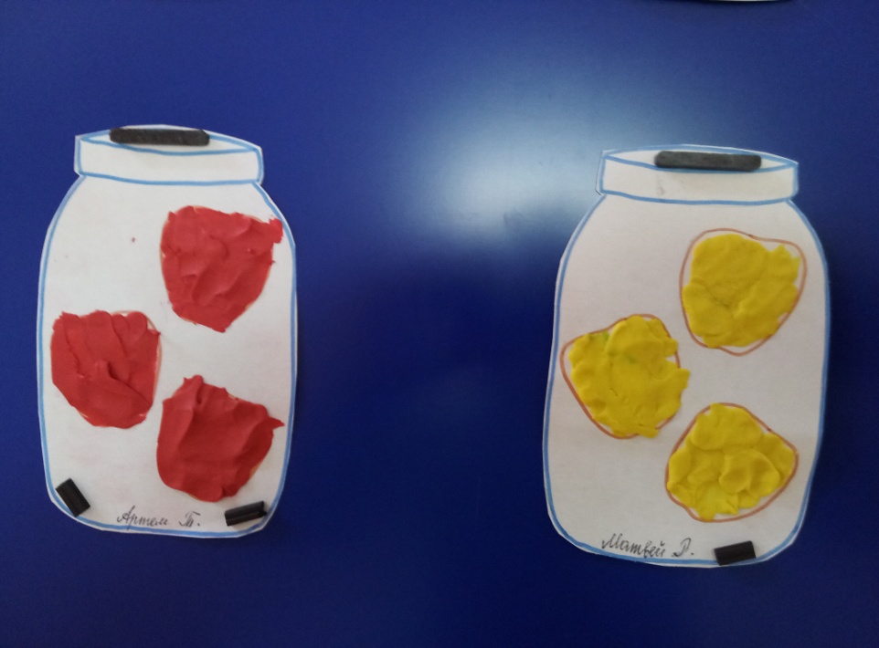 Цель: Учить детей располагать предметы согласно образцу. Закрепить знание детей о форме, цвете фруктов. Вызвать интерес к деятельности, расположить формы фруктов на «банке» согласно образцу. Способствовать возникновению радости от сделанной аппликации из пластилина . Развивать мелкую и общую моторику, зрительное внимание, восприятие, логическое мышление. Уметь слушать и слышать воспитателя, уважительное отношение к отвечающему товарищу. Расширять и активизировать словарь по теме. Закреплять приёмы аккуратного наклеивания. Развивать внимательность.