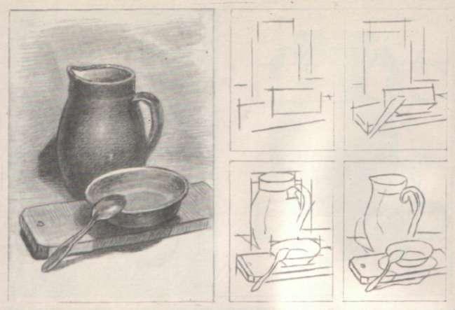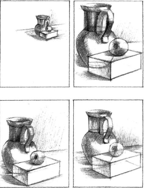 Если вопросы композиции предварительно уже были решены в эскизах, то наиболее удачная найденная композиция может быть повторена и перенесена на выбранный формат листа. Если же такого поиска не было, то изображение компонуют прямо на плоскости листа, при этом определяют наибольшую ширину и высоту все изображаемой постановки, а также приблизительную глубину, т.е. заход предметов одного за другой. Затем определяют большие пропорциональные соотношения между предметами, найдя каждому их место на плоскости стола и одновременно наметив их общую форму.