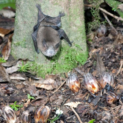 | Растительноядные | Не менее интересным фактом является то, что среди летучих мышей есть и вегетарианцы, питающиеся исключительно нектаром цветов, ягодами, фруктами, пыльцой, орехами. Зверьки, предпочитающие нектар цветов не только ими питаются, но ещё и опыляют их. Свиноносая летучая мышь, белый листонос - живут уединенно либо селятся маленькими группами не более 6 особей. | |