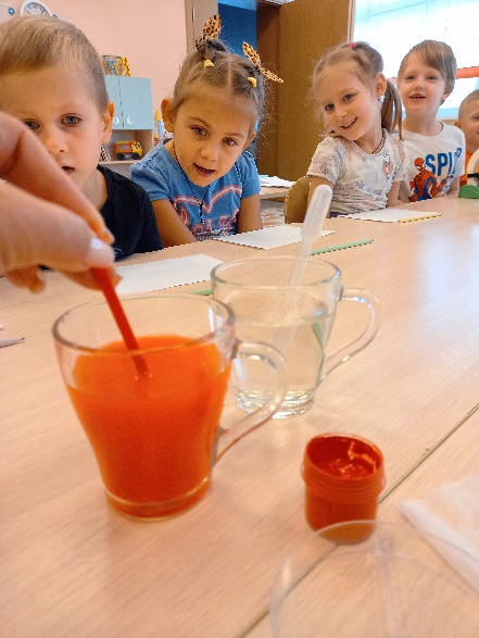 Дети опускают камешек в окрашенную воду. Что происходит? (камешка не видно – вода окрашена, не прозрачная). Рис 1