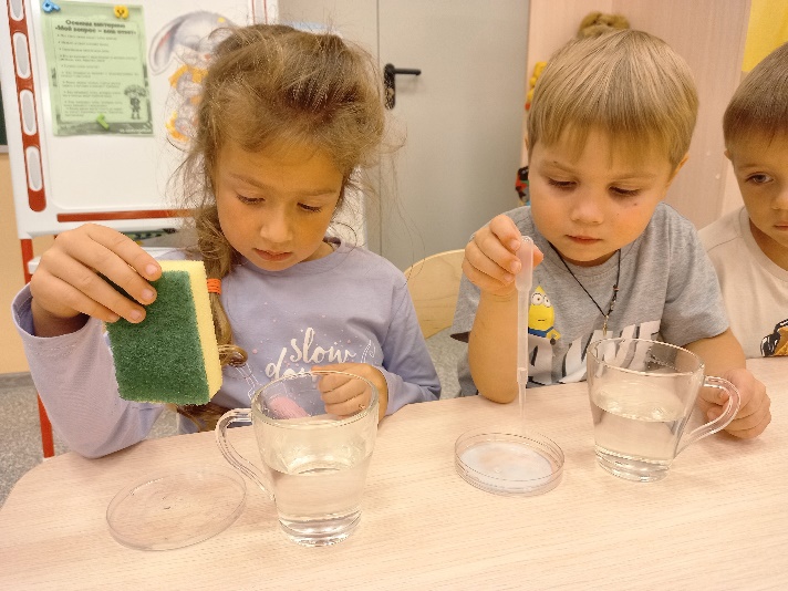 Материал: пипетка, две ёмкости с водой, полиэтиленовый пакет, губка, розетка.