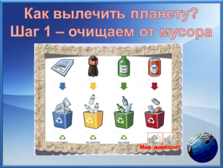 Эколог: Какой бы ни была эта планета: живой или обыкновенной, чтобы помочь обитателям этой планеты, нужно сначала помочьсамой планете. Ее нужно вылечитьот той болезни, которой заразили ее неразумные обитатели. Согласны? [Ответы детей] Тогда приступаем! С чего начнем? С самого простого? С мусора! Как говорят: