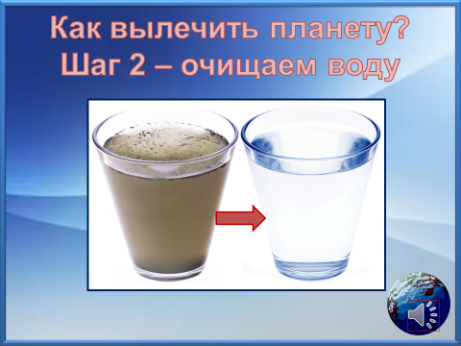Воспитатель: Но те только мусор есть в озерах и реках планеты. Много вредных веществ есть и в самой воде. Посмотрите, какая она серая! Чтобы очистить всю воду на планете, нам понадобятся гигантские фильтры.