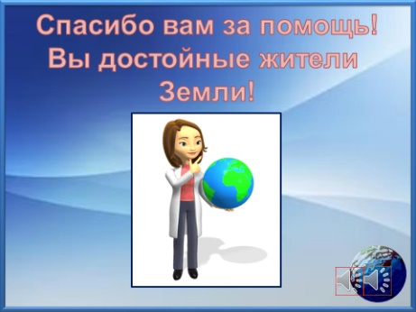Эколог: Спасибо вам за помощь, ребята! Вы достойные жители нашей планеты. До свидания!