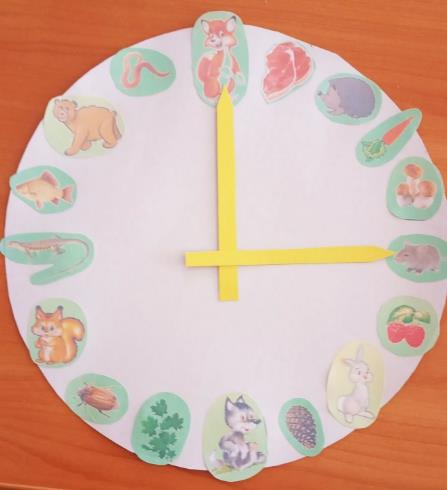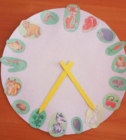 Маша: До пенёчка мы дошли, следующее задание от Мишки здесь нашли. Посмотрите, здесь в конверте необычные часы. Вместо цифр – картинки с животными, насекомыми и растениями (то, что едят животные). А ещё здесь мешочек с фигурками животных. Задание такое: нужно наощупь определить животное, достать фигурку из мешочка и на часах соединить стрелками изображение этого животного с тем, что он ест.