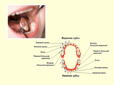 Учитель:Из них 10 зубов в верхней челюсти и 10 в нижней. (показать)