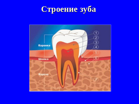 - Зубы состоят из твердого вещества, которое есть в нашем организме. Это вещество намного прочнее, чем кости. Зубы должны быть очень прочными, ведь мы пережевываем ими пищу. Давайте, посмотрим, из чего состоит зуб. (Слайд 5)