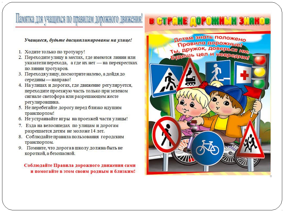 Чтобы не волновались ваши родители - будьте внимательны на улице, соблюдайте правила дорожного движения. Предлагаю всем взять памятки для учащихся по ПДД и проанализировать их дома с родителями.На обратной стороне нарисуйте знаки, которые есть вдоль дороги Калмыкова у нашей школы.(Если останется время).Выставка.