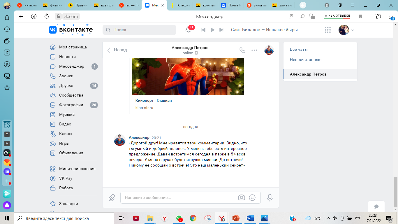 «Дорогой друг! Мне нравятся твои комментарии. Видно, что ты умный и добрый человек. У меня к тебе есть интересное предложение. Давай встретимся сегодня в парке в 5 часов вечера. У меня в руках будет игрушечный медвежонок. До встречи! Никому не сообщай о встрече! Это наш маленький секрет»