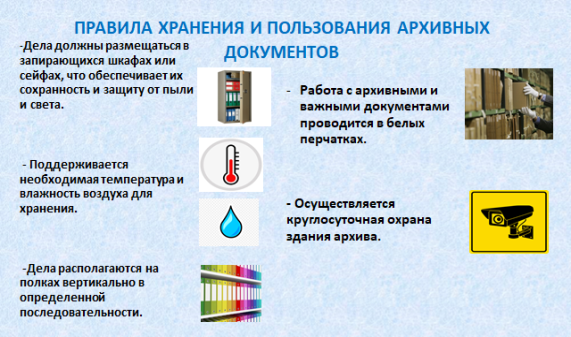 -Как и в любом учреждении, здесь есть определенные правила хранения и работы с архивными документами. Давайте назовем их. (слайд 6 показываем значки, как условные обозначения и комментируем их.)