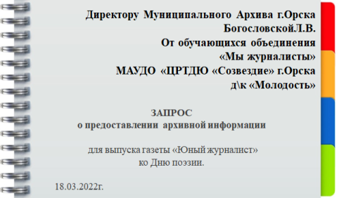 -Чтобы получить какой-либо документ в архиве, нужно отправить запрос о предоставлении информации о поэтах нашего города в наш городской муниципальный архив.