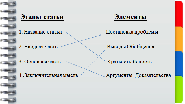 Педагог: Ребята, перед вами карточка №3, переверните ее, и соедините этап статьи с нужным составляющим элементом.